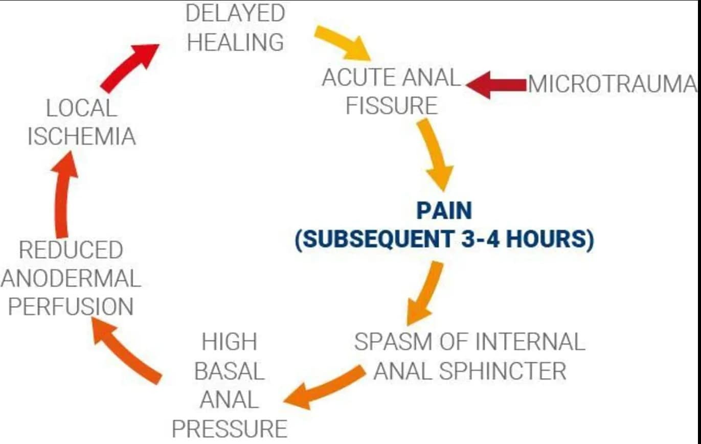 Chronic long-standing constipation or chronic diarrhea → frequent rubbing, friction, or trauma in the inner lining of anal mucosa→ cut or tear in the inner lining of anal mucosa (painful Fissure-in-ano) → fear or anxiety due to pain leads to avoidance or postponing or holding back of stools → chronic constipation→ long, hard stools cause straining during defecation→ Fissure-in-ano increases→ more fear and avoidance during defecation (habitual constipation)→ anal sphincter spasm→ sluggish (slow) or less blood circulation around the anal canal→ delayed wound healing